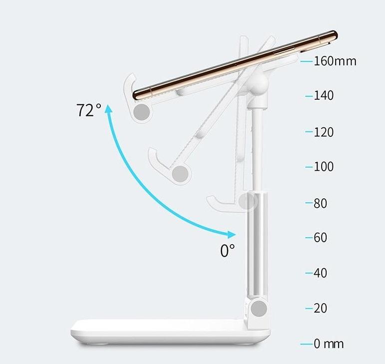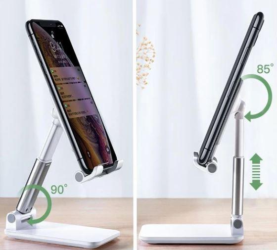 Trata-se de um suporte para telefone e tablet que pode ser dobrado sem montagem, pode ser transportado e possui ajuste de vários ângulos.